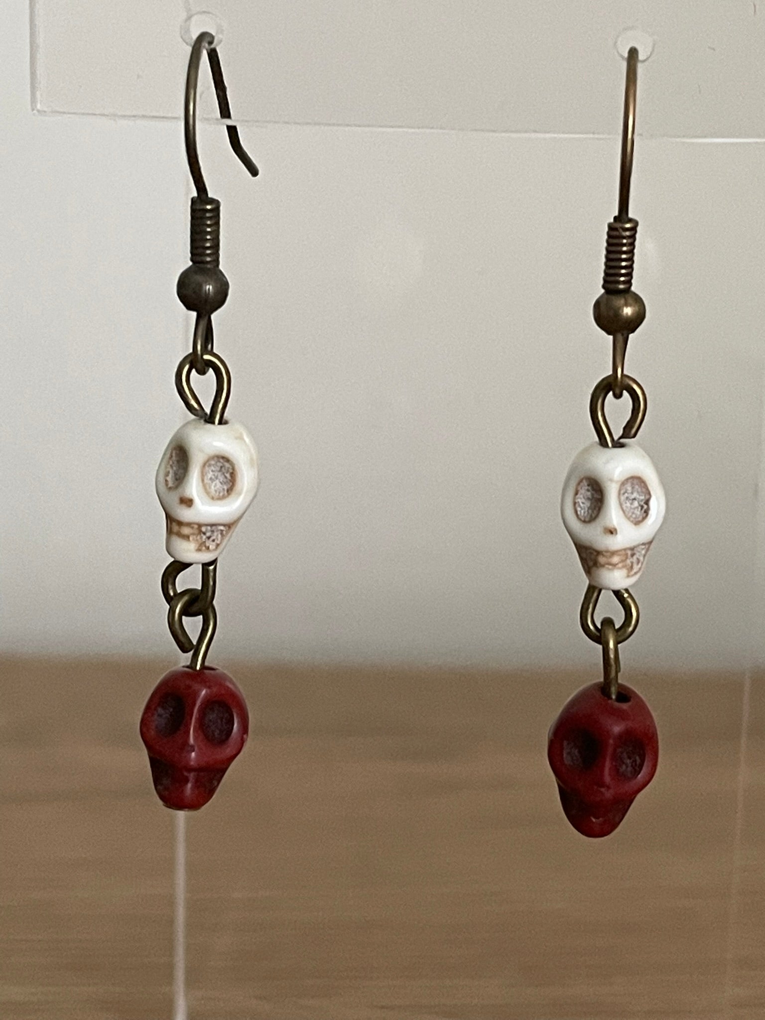 Two stacked skull beads on each earring: white (top) & red/brown (bottom)