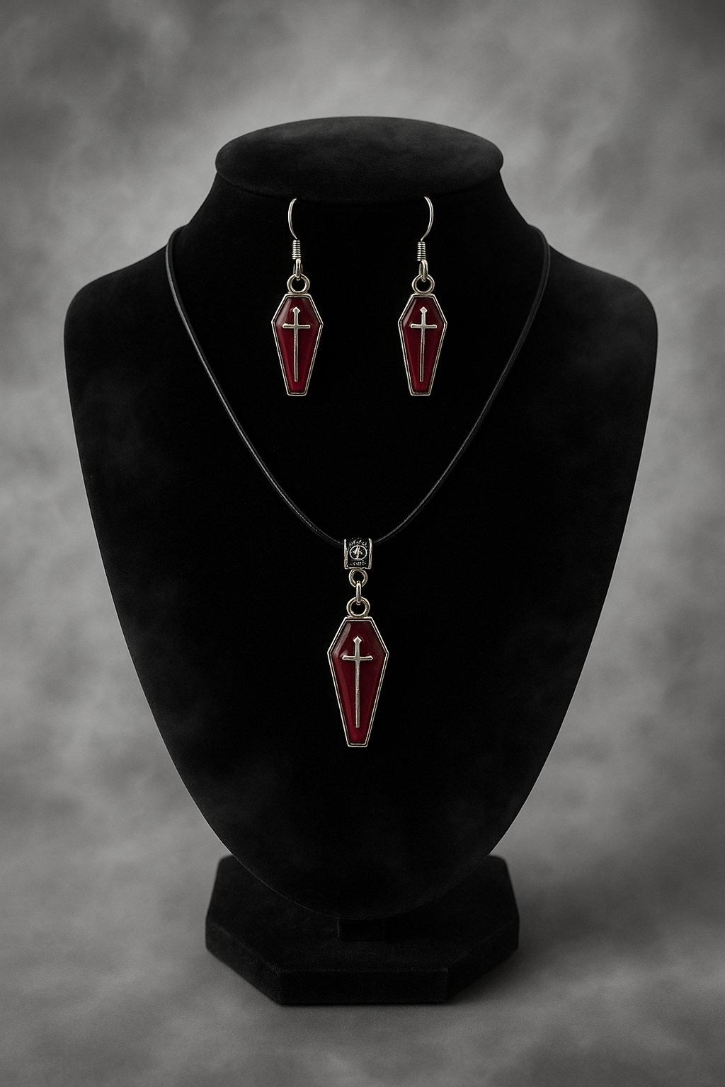 Step into the shadows with this beautifully macabre coffin-shaped jewelry set, perfect for lovers of gothic fashion, Halloween vibes, or witchy aesthetics. Handcrafted with deep blood-red enamel and detailed with a silver-tone cross, this set brings a hauntingly elegant touch to any outfit.